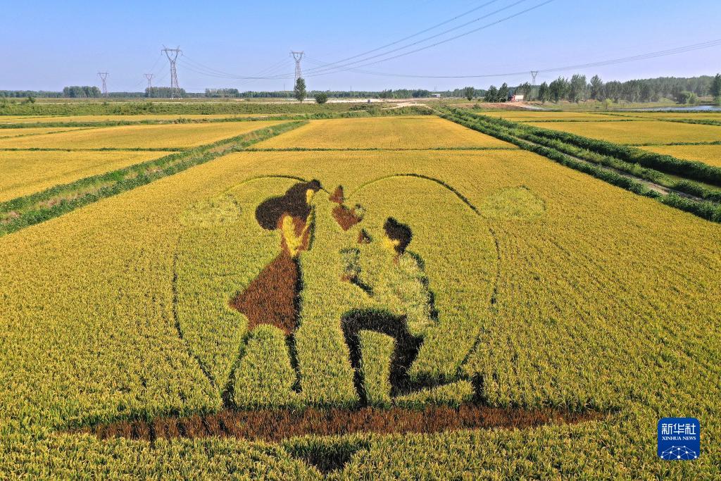初秋時(shí)節,遼寧省鞍山市臺安縣遼河文化旅游景區的稻田畫(huà)吸引不少游客前來(lái)參觀(guān)游覽。由多種顏色組成的巨型稻田畫(huà)勾勒出豐收壯美景象。