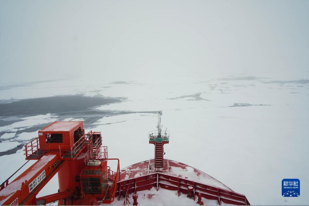 這是抵達北極點(diǎn)瞬間,“雪龍2”號極地科考破冰船前方的浮冰(9月5日攝)。