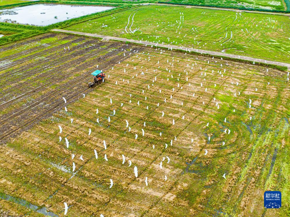 9月7日,浙江省溫嶺市石橋頭鎮土坦新村,農民駕駛農機翻耕整地,成群的白鷺跟隨農機覓食、飛舞(無(wú)人機照片)。