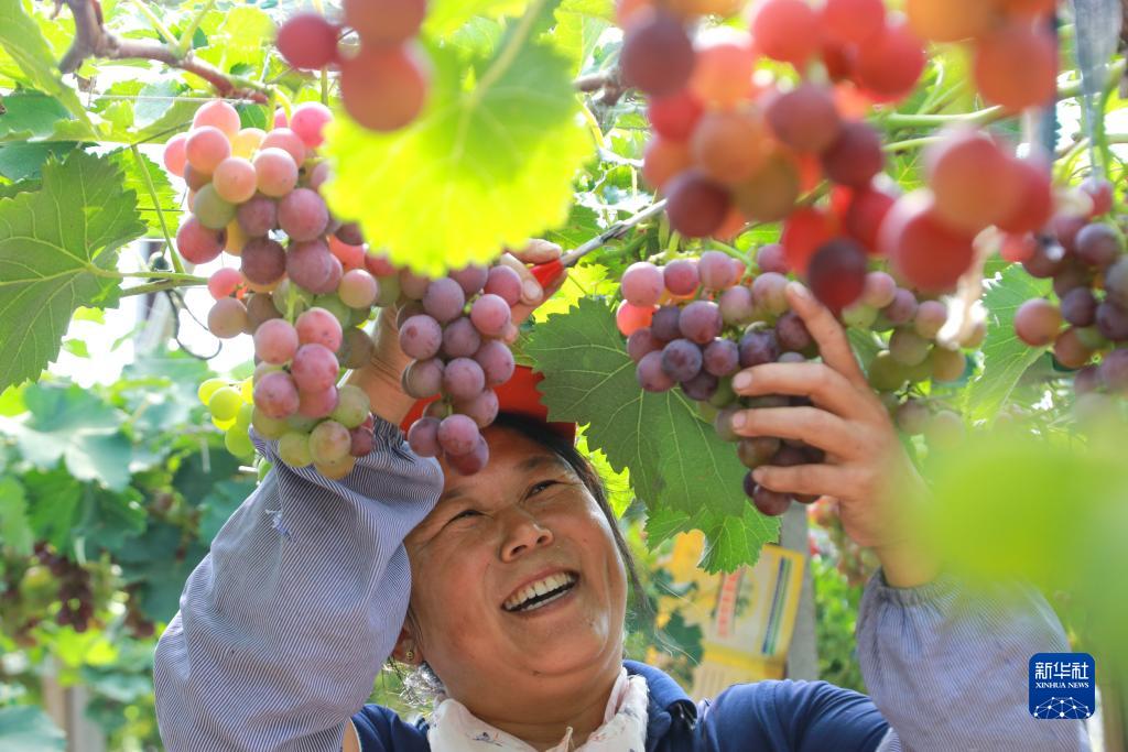9月7日,山東省高密市闞家鎮松興屯村葡萄大棚內,村民在采摘葡萄。