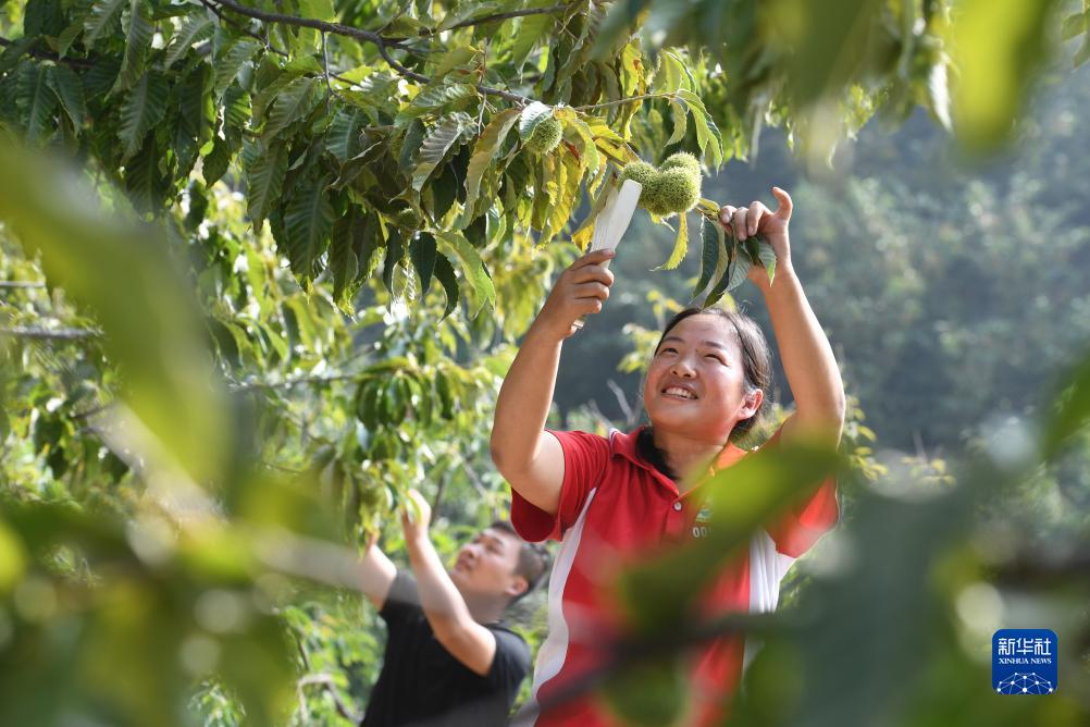 9月7日,河北省石家莊市平山縣北滾龍溝村農民在山里采收板栗。