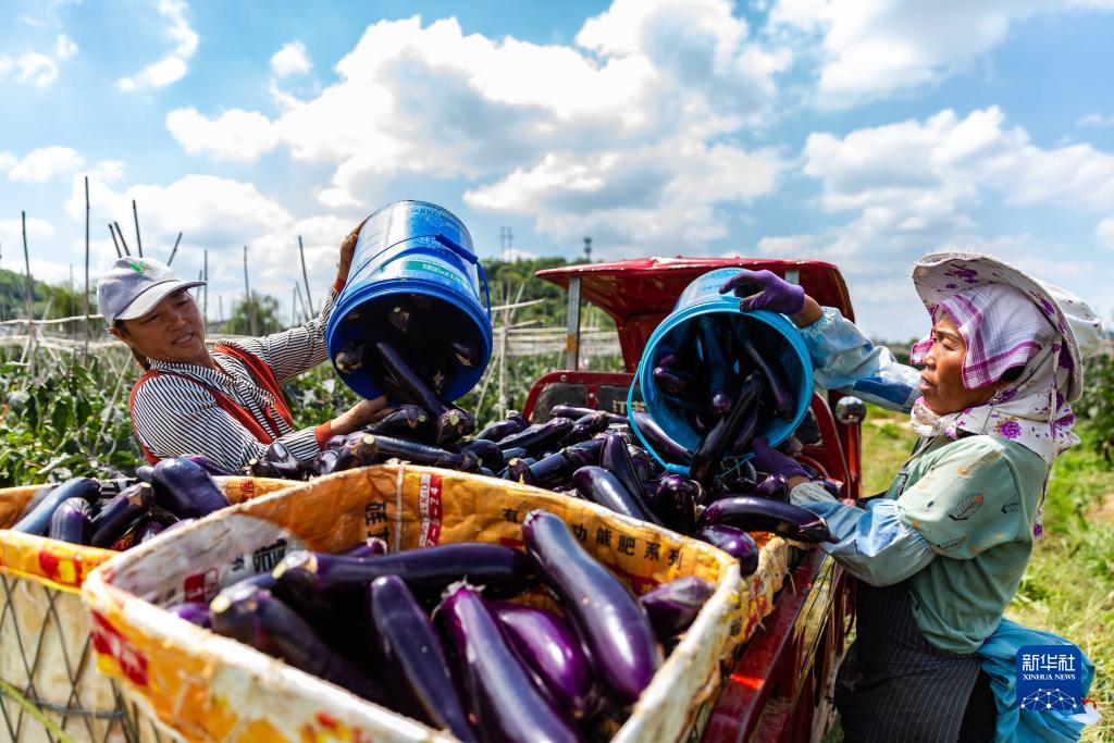 9月6日,農民在貴州省安順市西秀區舊州鎮浪塘村將采摘的茄子裝車(chē)。