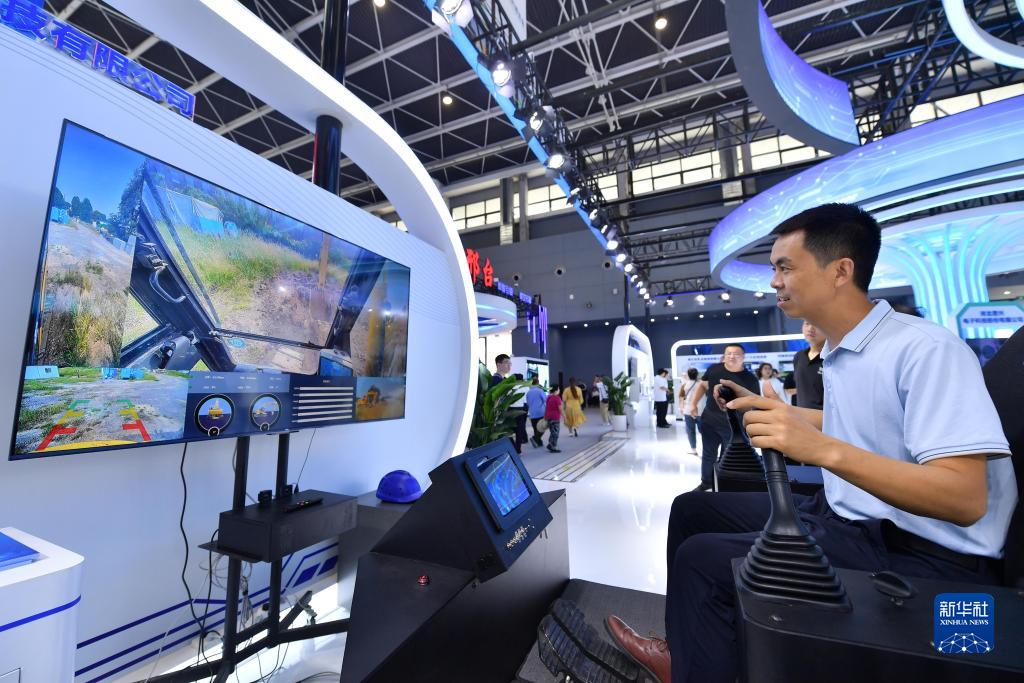 9月7日,參觀(guān)者在2023中國國際數字經(jīng)濟博覽會(huì )上體驗挖掘機5G遠程駕駛系統。