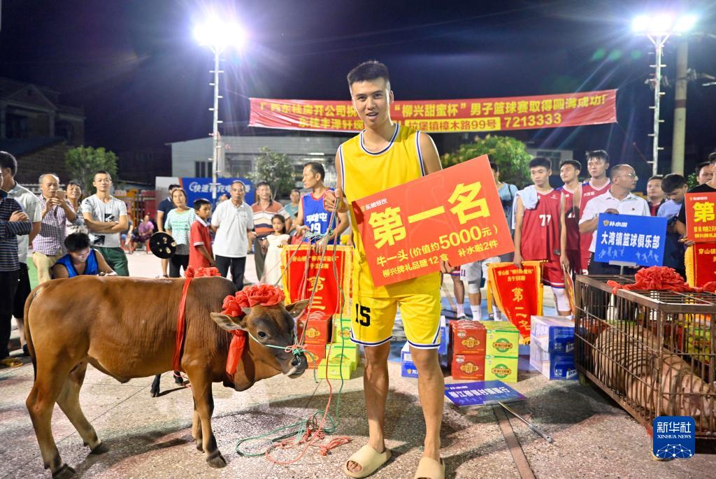 9月6日晚,在柳江區穿山鎮高平村平地屯籃球場(chǎng),冠軍球隊隊員展示獲得的獎品。