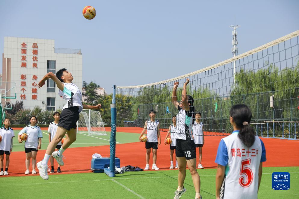 9月7日,山東省青島第三十三中學(xué)的學(xué)生在進(jìn)行排球訓練。