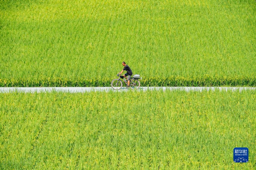 9月7日,游客在稻田間騎行。