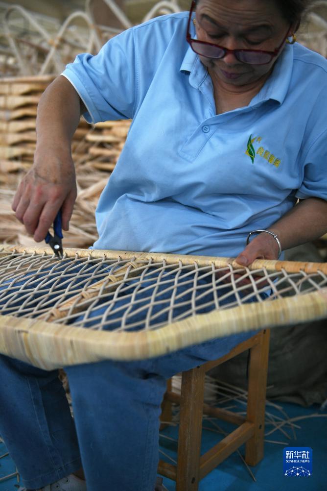 9月7日,在位于漢中市的陜西良順匠心實(shí)業(yè)有限公司,工作人員在編織藤制品。