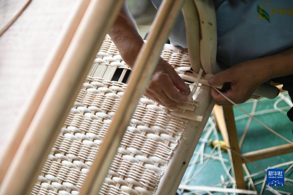9月7日,在位于漢中市的陜西良順匠心實(shí)業(yè)有限公司,工作人員在編織藤椅。