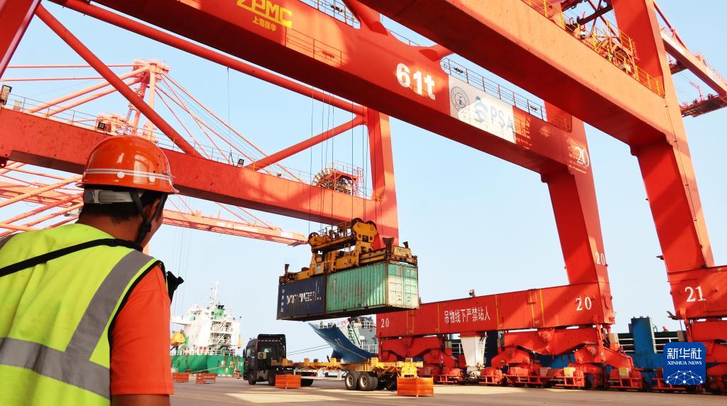 9月7日,在江蘇省連云港港集裝箱碼頭,貨輪在進(jìn)行集裝箱裝卸作業(yè)。