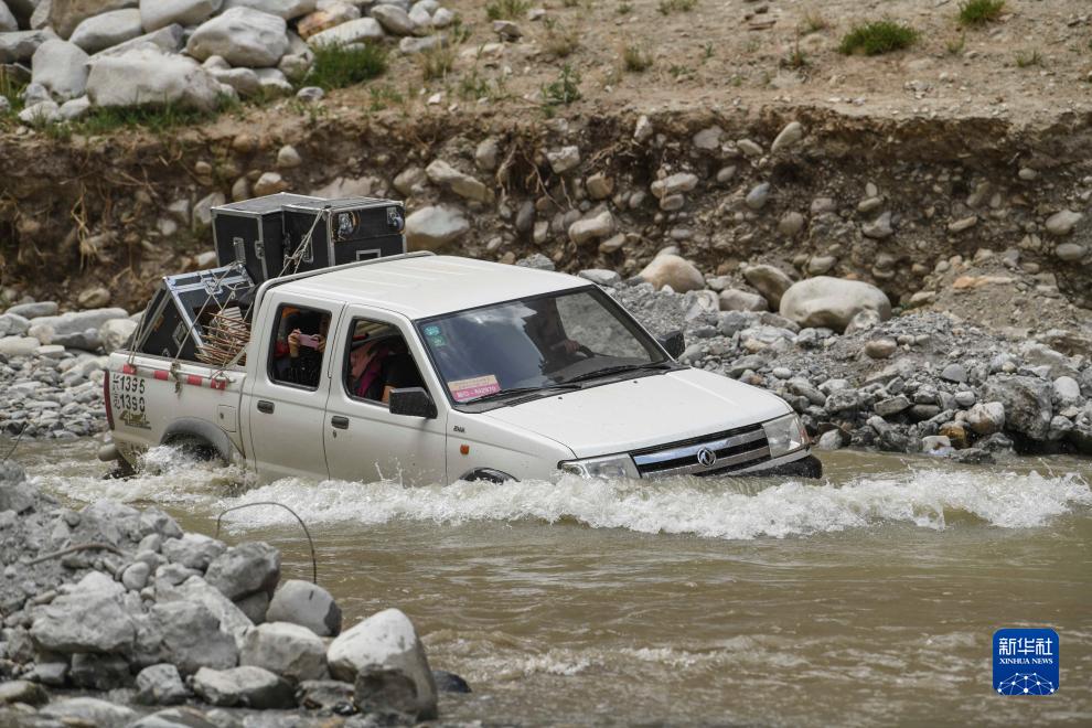 在一次下鄉進(jìn)村演出途中,新疆塔縣文工團演員拜合提亞爾·居馬汗和同事駕車(chē)穿越一處涉水路段(2020年6月5日攝)。