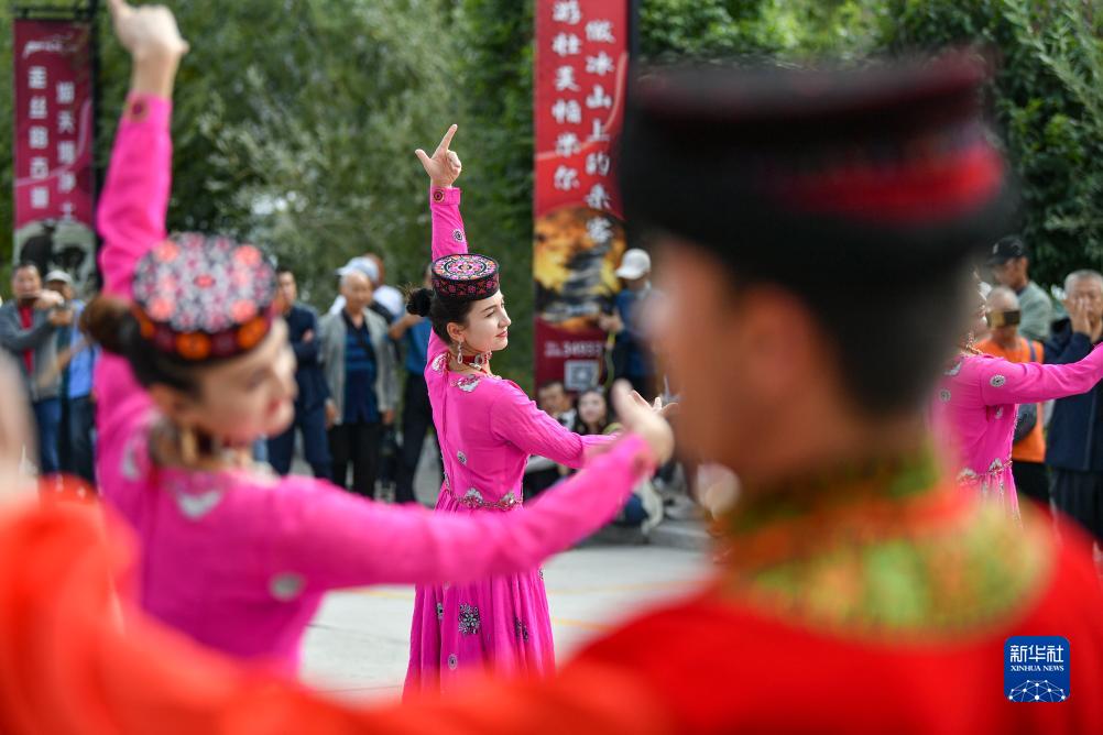 新疆塔縣文工團演員古麗巴努爾·庫爾恰克(中)和同事們一起跳舞歡迎遠道而來(lái)的游客(9月2日攝)。