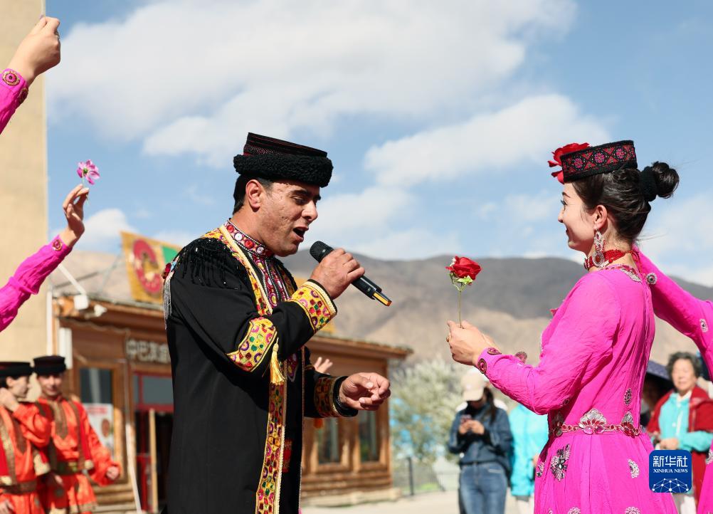 拜合提亞爾·居馬汗為游客演唱《花兒為什么這樣紅》,妻子古麗巴努爾·庫爾恰克在一旁伴舞(9月4日攝)。