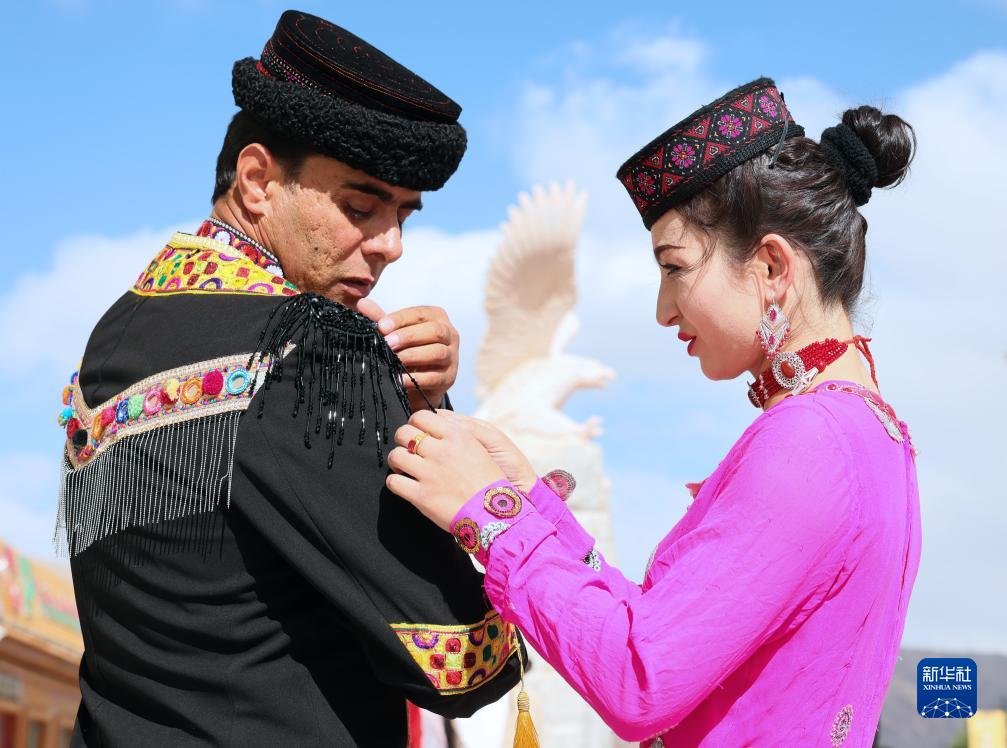 迎賓演出開(kāi)始前,古麗巴努爾·庫爾恰克為丈夫整理演出服裝(9月4日攝)。