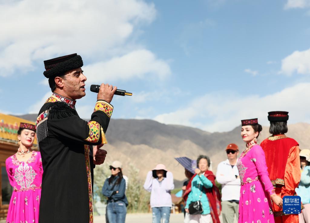 在新疆塔縣帕米爾旅游區游客服務(wù)中心,拜合提亞爾·居馬汗為游客演唱《花兒為什么這樣紅》(9月4日攝)。