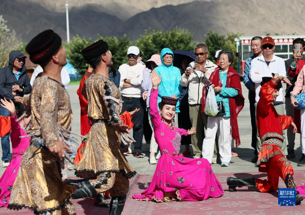 古麗巴努爾·庫爾恰克和同事們一起為遠道而來(lái)的游客表演鷹舞(9月4日攝)。