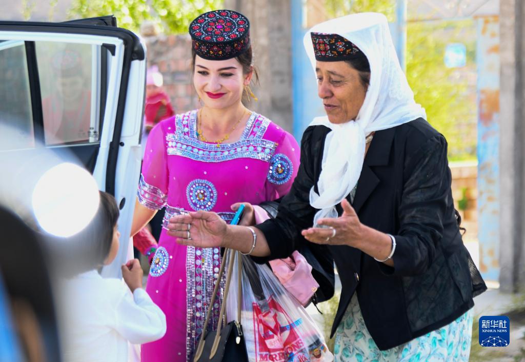 古麗巴努爾·庫爾恰克(中)帶著(zhù)孩子們回家,拜合提亞爾·居馬汗的母親出門(mén)迎接孩子(9月4日攝)。