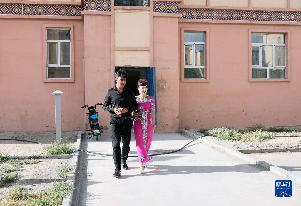 下班后,拜合提亞爾·居馬汗和妻子并肩走在位于縣城的新家樓下(9月4日攝)。