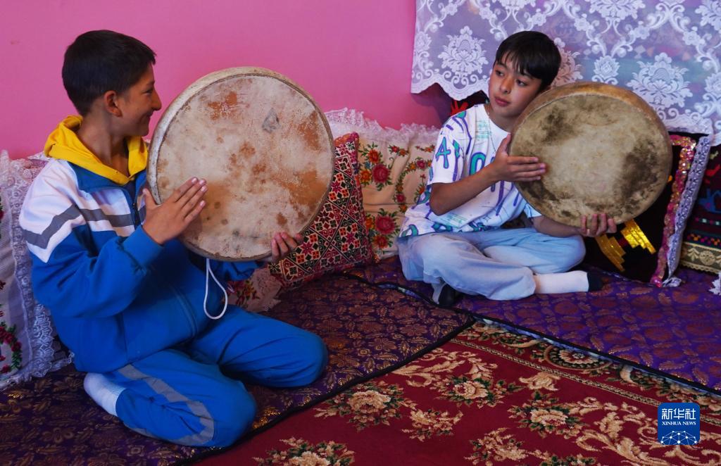 拜合提亞爾·居馬汗的兒子木拉夏提(右)與表哥一起敲手鼓(9月4日攝)。