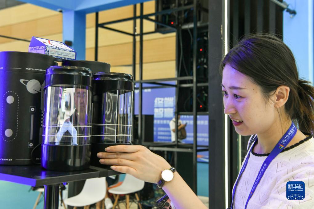 9月7日,在“2023世界顯示產(chǎn)業(yè)大會(huì )新型顯示創(chuàng )新成果展”現場(chǎng),觀(guān)眾在查看全息艙產(chǎn)品。