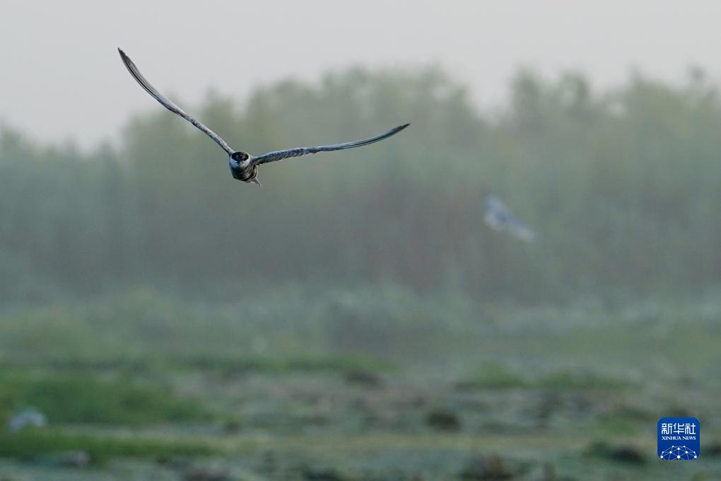 鳥(niǎo)兒在江蘇省鹽城市建湖縣九龍口國家濕地公園內飛翔(9月7日攝)。