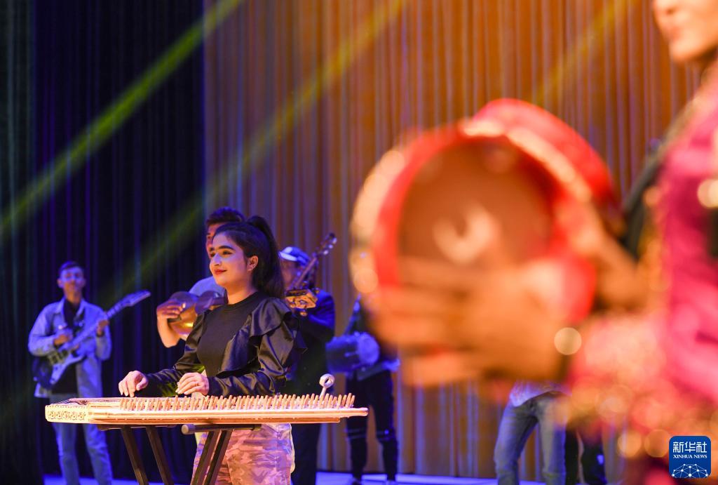 新疆塔縣文工團樂(lè )手阿孜古麗·亞克巴義在排練時(shí)演奏樂(lè )器卡農琴(9月7日攝)。新華社記者 胡虎虎 攝