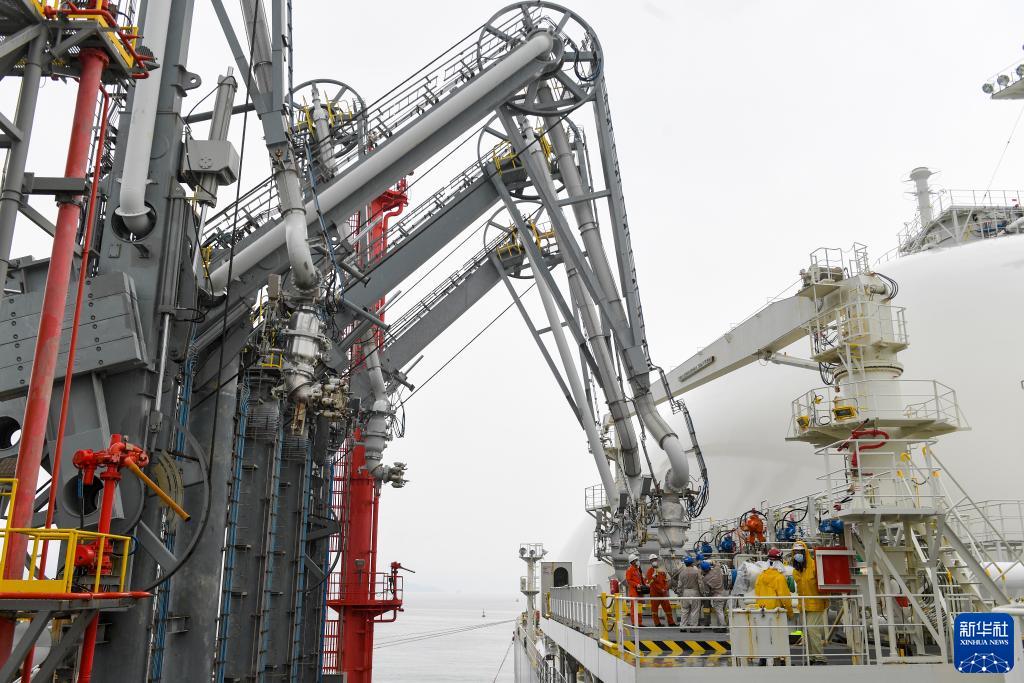 9月7日,廣東大鵬液化天然氣(LNG)接收站工作人員操作卸料臂與“能量自信”號運輸船對接。