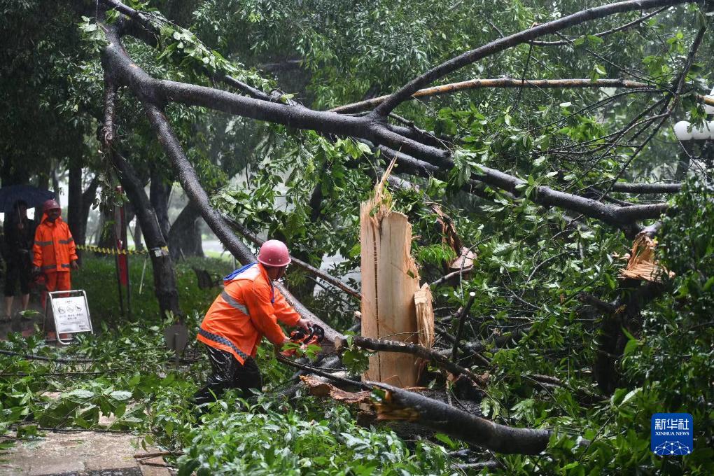 9月8日,深圳園林綠化工人冒雨清理倒伏的樹(shù)木。