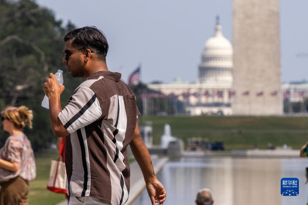 9月7日,在美國首都華盛頓,一名男子喝水抵御高溫天氣。