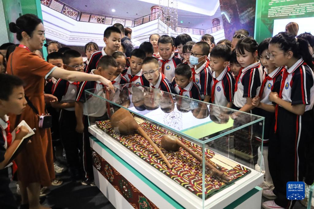 9月7日,學(xué)生們在第六屆絲綢之路(敦煌)國際文化博覽會(huì )土庫曼斯坦專(zhuān)題展上參觀(guān)。