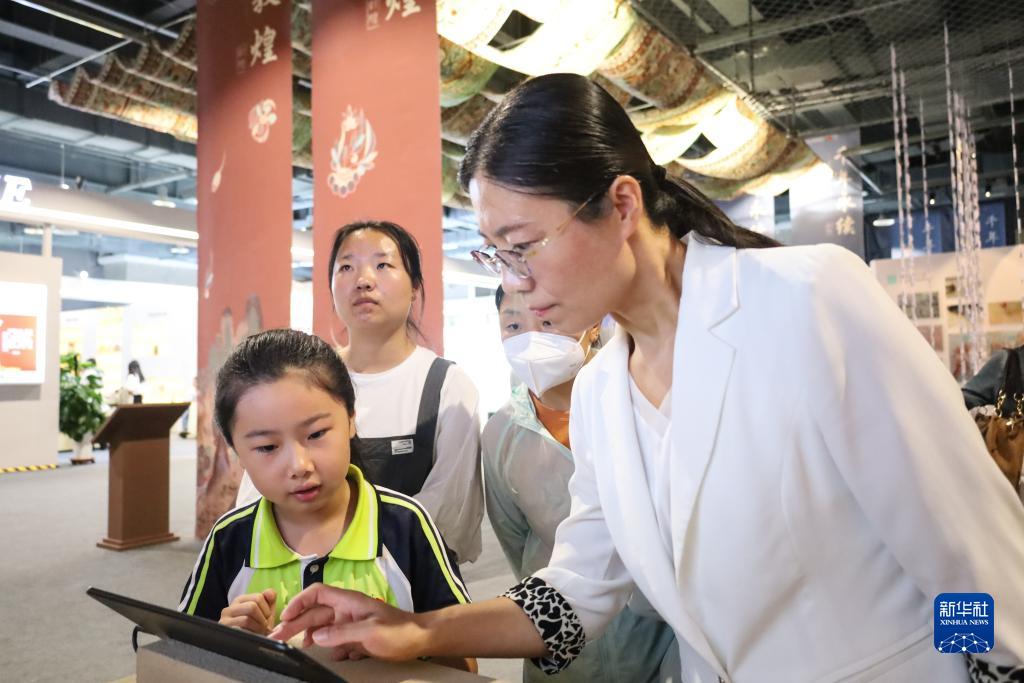 9月7日,觀(guān)眾在第六屆絲綢之路(敦煌)國際文化博覽會(huì )世界文化遺產(chǎn)保護典范和敦煌學(xué)研究高地建設成果展上感受數字繪壁畫(huà)裝置。