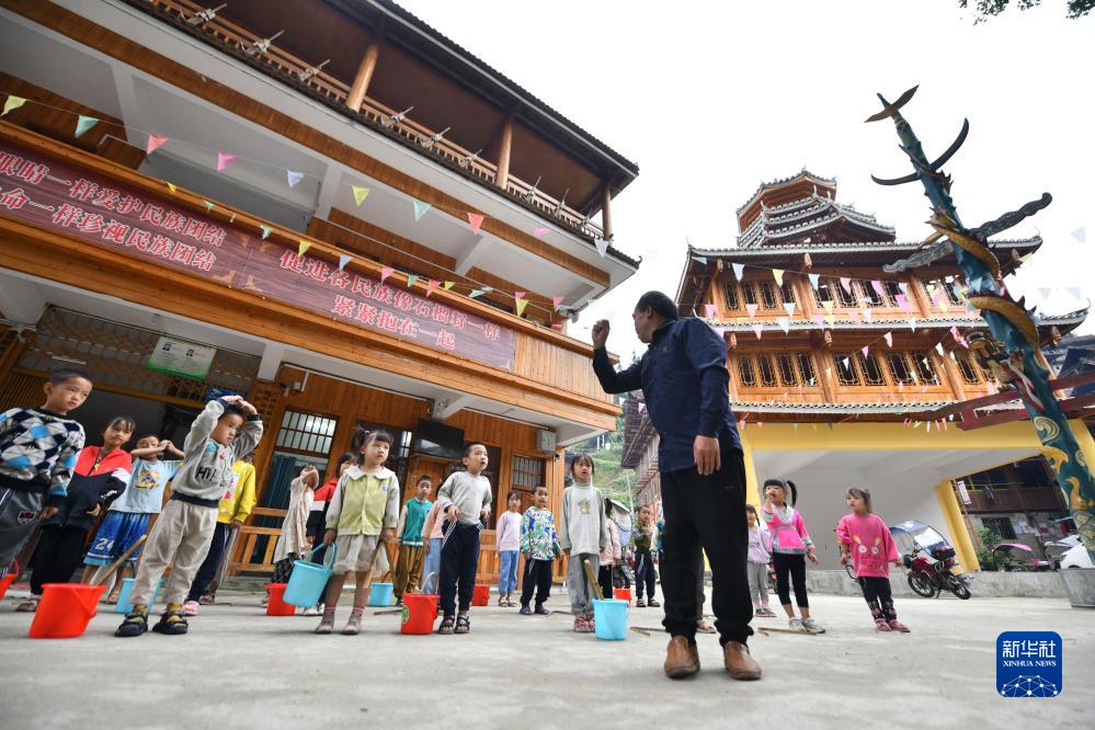 在烏英苗寨教學(xué)點(diǎn),潘先鋒在教新生們學(xué)習排隊(2023年9月1日攝)。