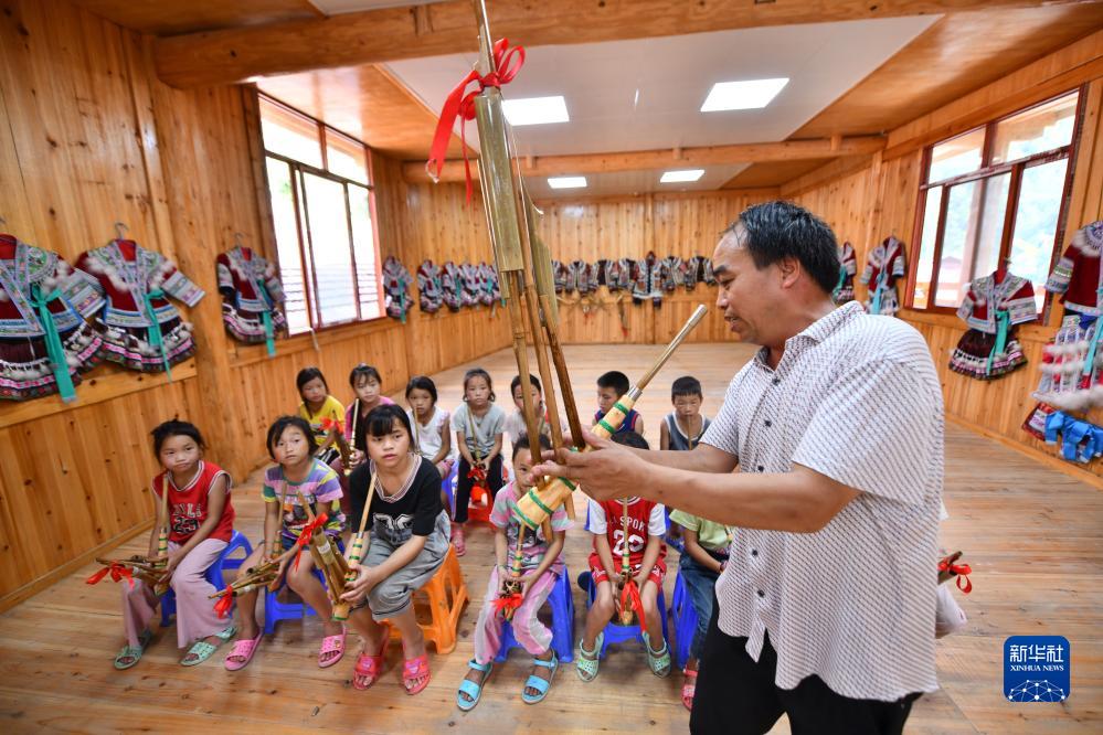 在烏英苗寨教學(xué)點(diǎn),潘先鋒在非遺課堂上教孩子們吹蘆笙(2021年7月15日攝)。