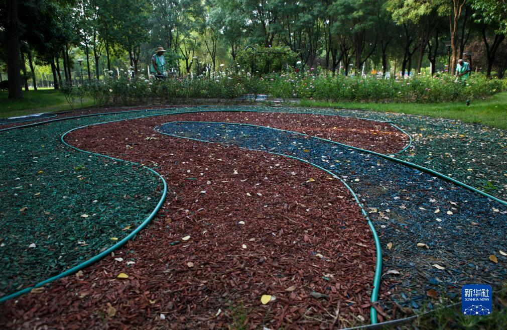 9月7日在德州市行政中心綠地拍攝的用園林綠化垃圾循環(huán)再造的園林景觀(guān)。