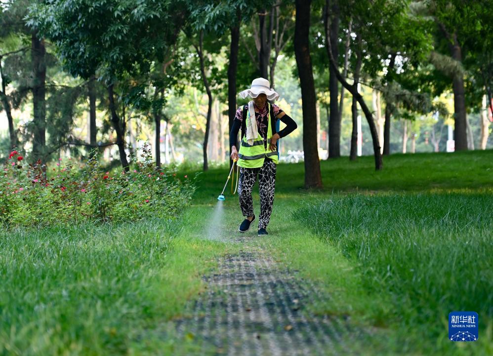 9月7日,在德州市行政中心綠地,綠化養護工人在播撒過(guò)草籽的綠道上灑水。