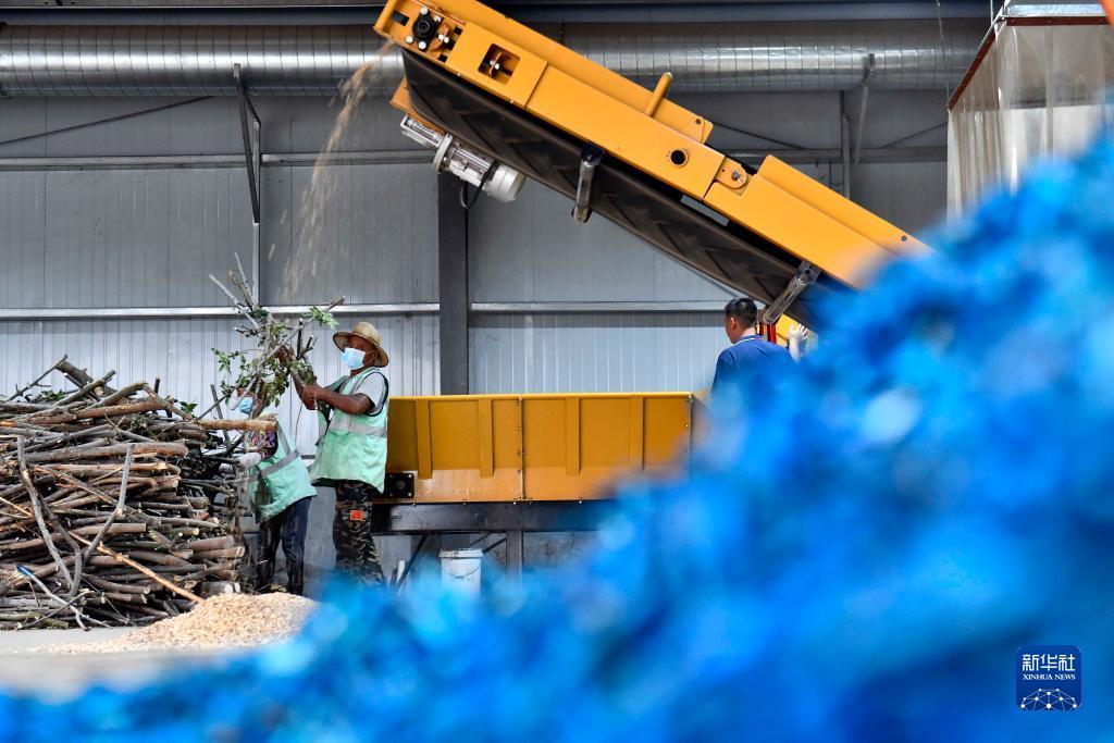 9月7日,在德州市碳循環(huán)創(chuàng )新示范基地,工作人員對園林綠化垃圾進(jìn)行粉碎加工作業(yè)。