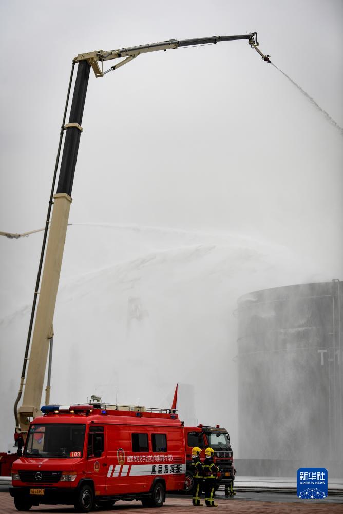 9月8日,在實(shí)戰滅火演練現場(chǎng),大跨度高噴消防車(chē)對甲醇儲罐進(jìn)行冷卻滅火。