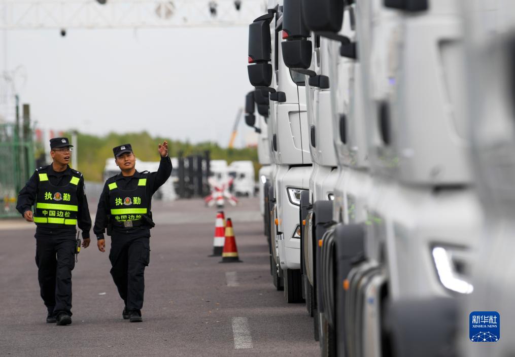 霍爾果斯出入境邊防檢查站民警在檢查等待出口的車(chē)輛(9月6日攝)。