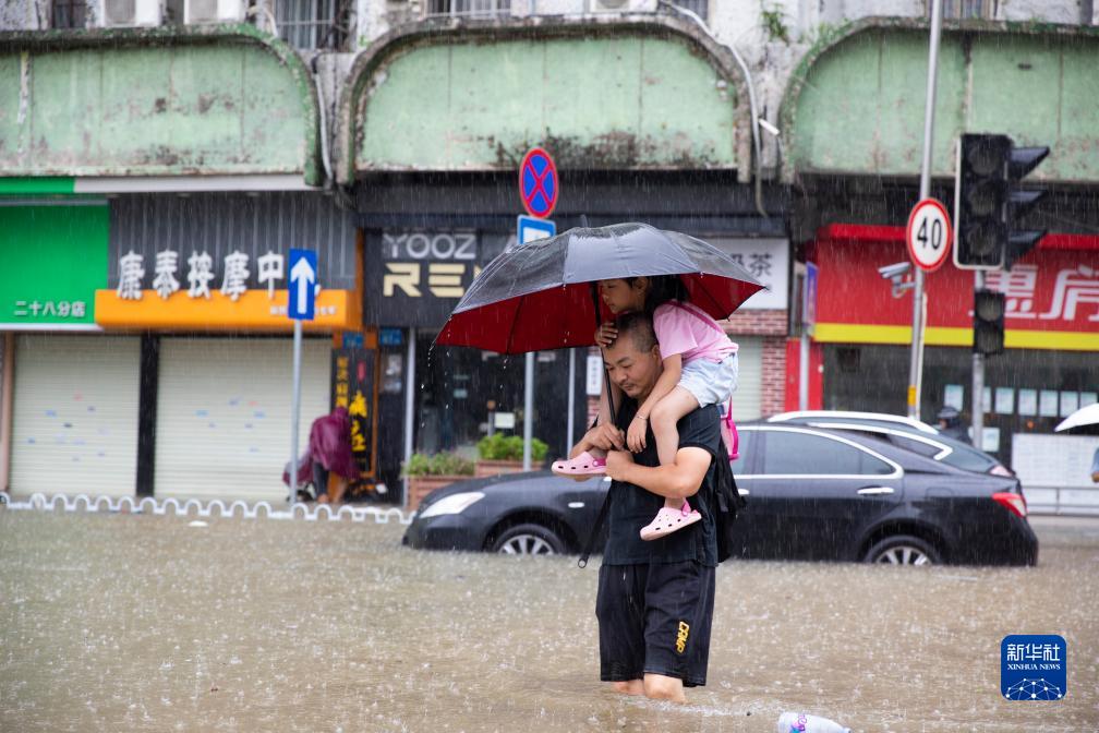 9月8日,在廣州市番禺區市橋地鐵站附近,家長(cháng)背著(zhù)孩子涉水前行。