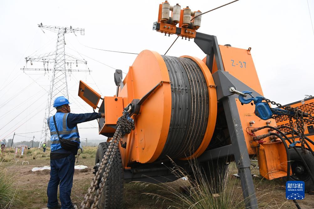 9月8日,工人在武威市天??h境內的蘭新(張)三四線(xiàn)甘肅牽引站330千伏外部供電工程施工現場(chǎng)作業(yè)。