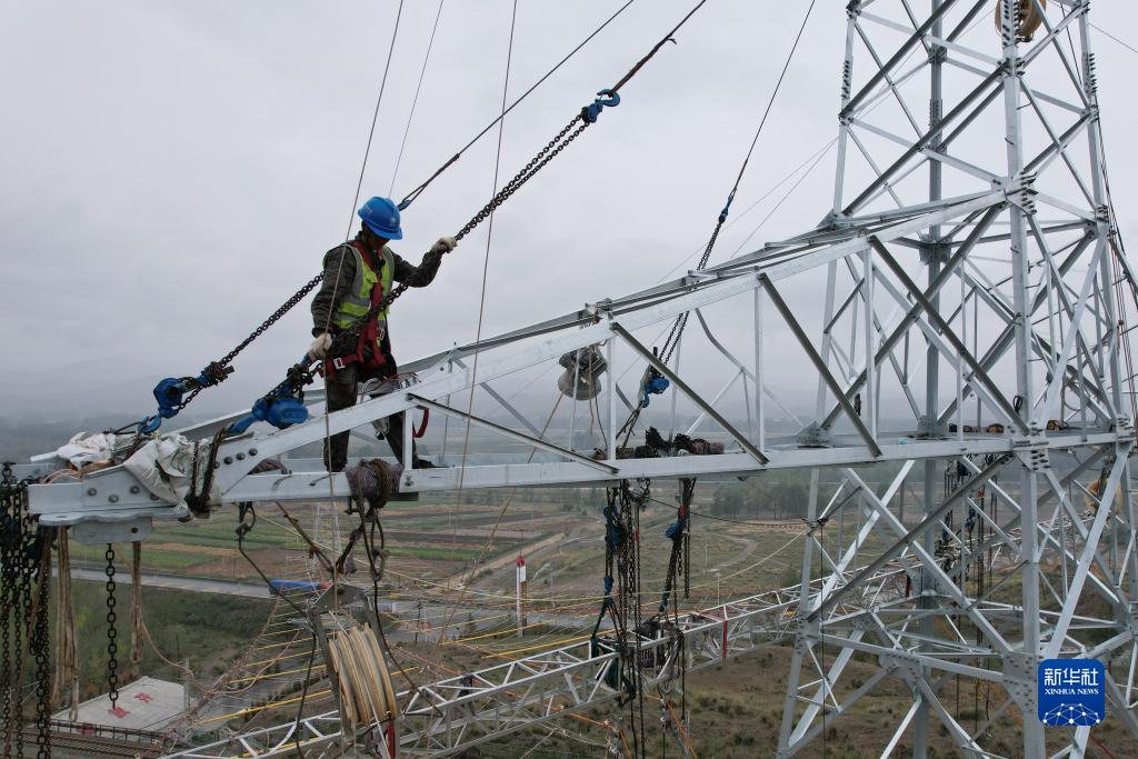 9月8日,工人在武威市天??h境內的蘭新(張)三四線(xiàn)甘肅牽引站330千伏外部供電工程施工現場(chǎng)作業(yè)(無(wú)人機照片)。