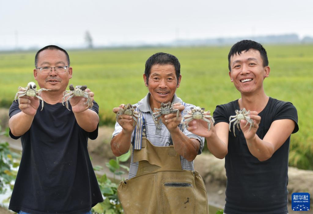 9月8日,農民在沈陽(yáng)市沈北新區興隆臺街道青年農場(chǎng)稻田里展示收獲的河蟹。