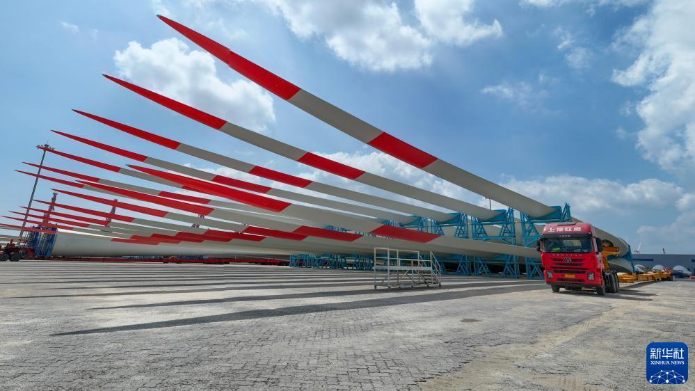 一批風(fēng)電葉片在江蘇鹽城港射陽(yáng)港區碼頭等待運輸(9月8日攝,無(wú)人機照片)。