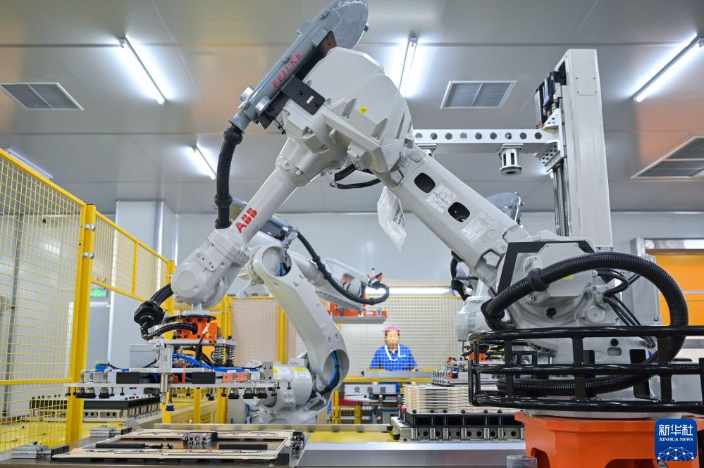 智能機器人在緯景儲能鹽城智造基地生產(chǎn)車(chē)間進(jìn)行鋅鐵液流電池電堆總裝堆疊作業(yè)(9月8日攝)。