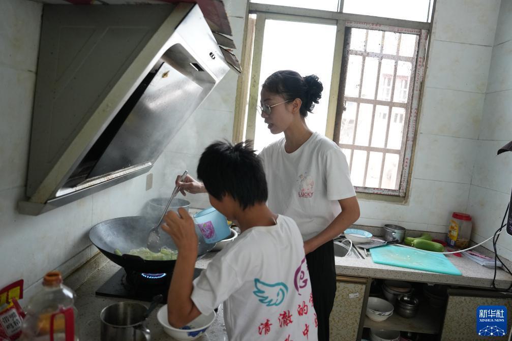 9月7日,陳艷輝(右)在湖南省株洲市茶陵縣界首鎮大新村的小美家中教小美做飯。新華社記者 薛宇舸 攝