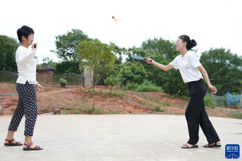 9月7日,陳艷輝(右)在湖南省株洲市茶陵縣界首鎮賀鋪村的小靜家中陪小靜做運動(dòng)。新華社記者 薛宇舸 攝