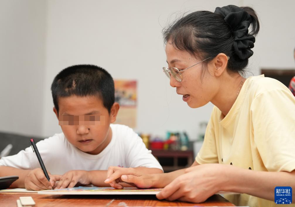 9月6日,陳艷輝(右)在湖南省株洲市茶陵縣界首鎮花甲村的小宇家中送教。小宇因患先天性腦積水智力受損,陳艷輝和陳二文教小宇認字、用計算器算術(shù)等知識。新華社記者 薛宇舸 攝