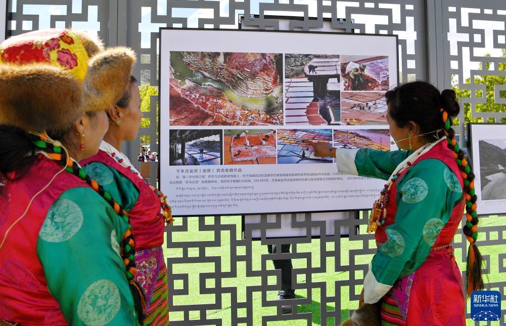 在拉薩市林周縣邊交林鄉當杰村,人們在欣賞第十六屆西藏珠穆朗瑪攝影大展作品(9月8日攝)。