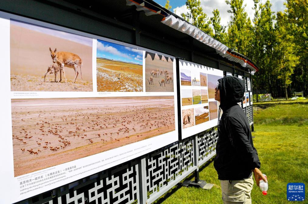 在拉薩市林周縣邊交林鄉當杰村,觀(guān)眾在欣賞第十六屆西藏珠穆朗瑪攝影大展作品(9月8日攝)。