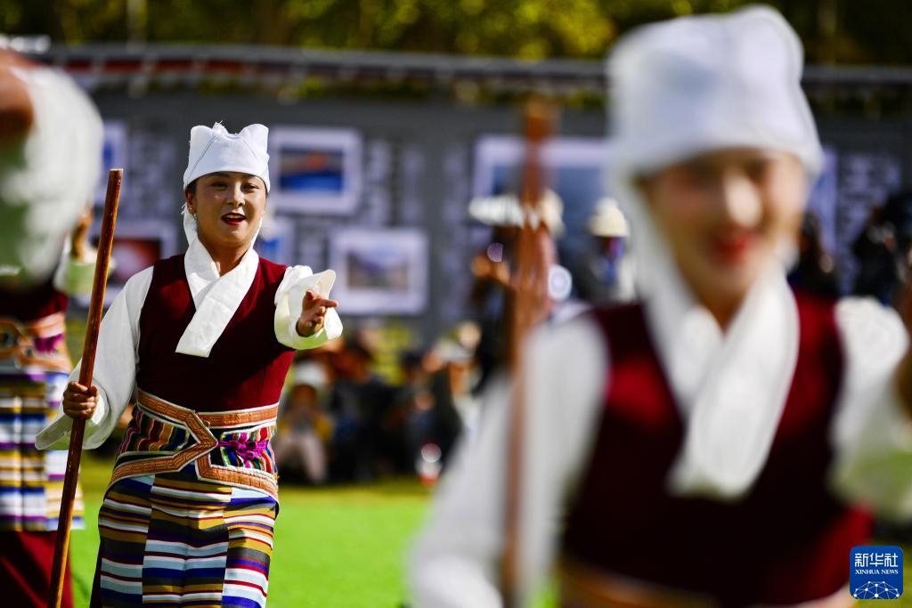 在拉薩市林周縣邊交林鄉當杰村,演員在第十六屆西藏珠穆朗瑪攝影大展開(kāi)幕式上表演節目(9月8日攝)。