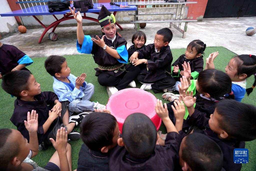 柳吉小學(xué)教師王章艷帶領(lǐng)學(xué)生在課間玩游戲(9月7日攝)。